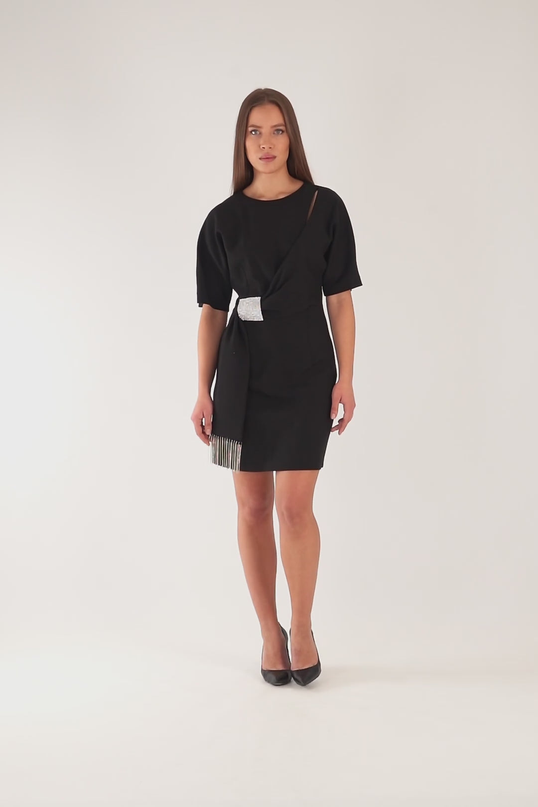 Taş Tokalı Püsküllü Siyah Mini Elbise - Perle Donna