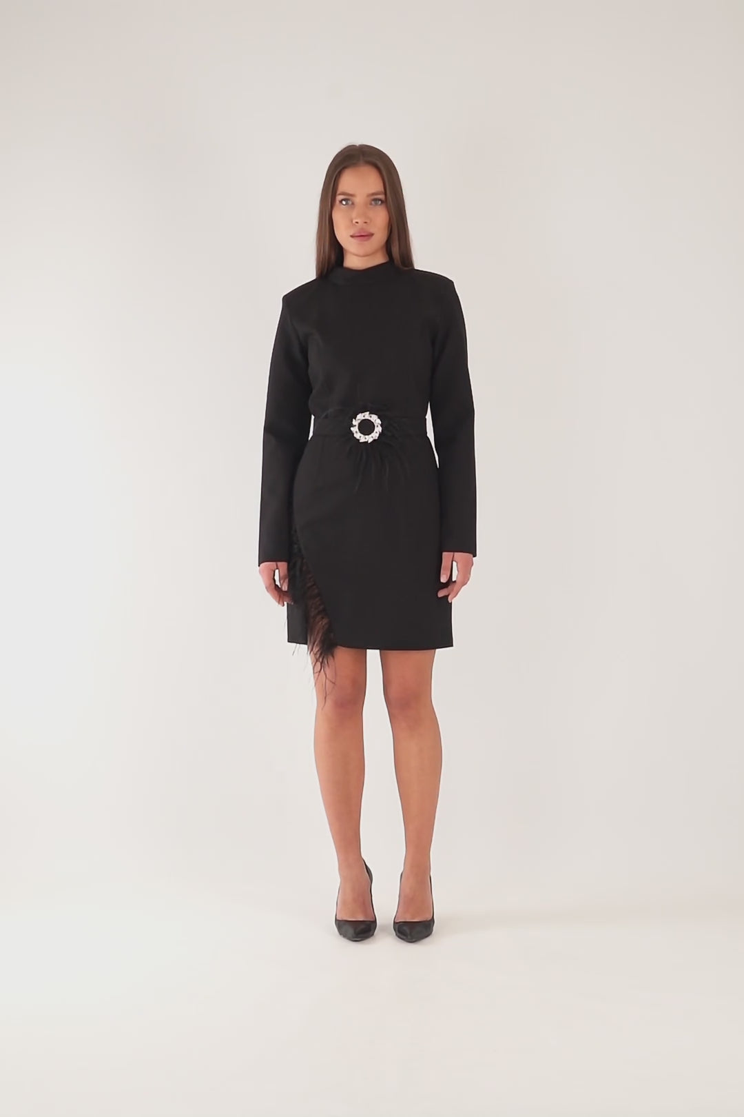Tüylü Taş Tokalı Siyah Mini Elbise - Perle Donna