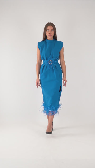 Modern çizgilerle tasarlanmış bu mavi midi elbise, tüy detayları ve taş tokalı kuşağıyla zarafeti ön plana çıkarıyor. Omuz vatkaları güçlü bir siluet oluştururken, yırtmaç detayı feminen bir dokunuş katıyor. Düğün, davet, kokteyl veya özel gecelerde dikkat çekici bir görünüm için ideal seçimdir.